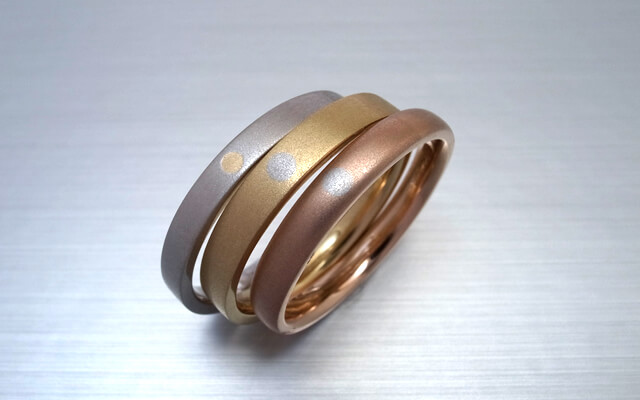 当店の結婚指輪では、ベースとなる金属に、異なる金属を「かたどり」、「はめる」ことができます。